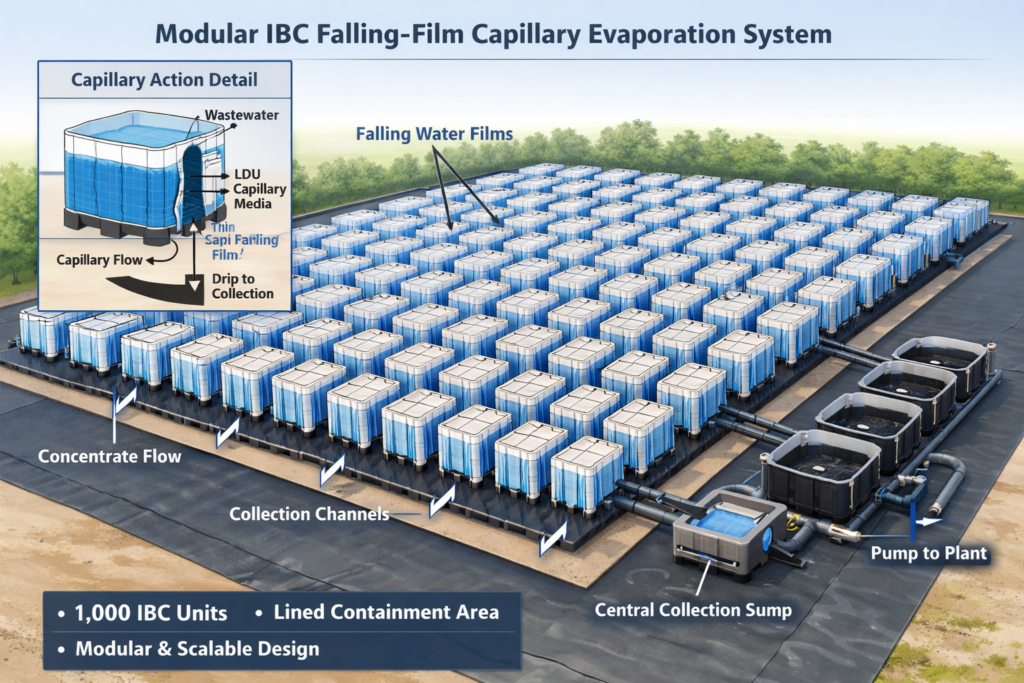Capillary action evaporation uses engineered porous or fibrous media to spread wastewater into ultra-thin films. This dramatically increases surface area, allowing faster evaporation with minimal energy input, unlike conventional deep evaporation ponds or thermal evaporators.